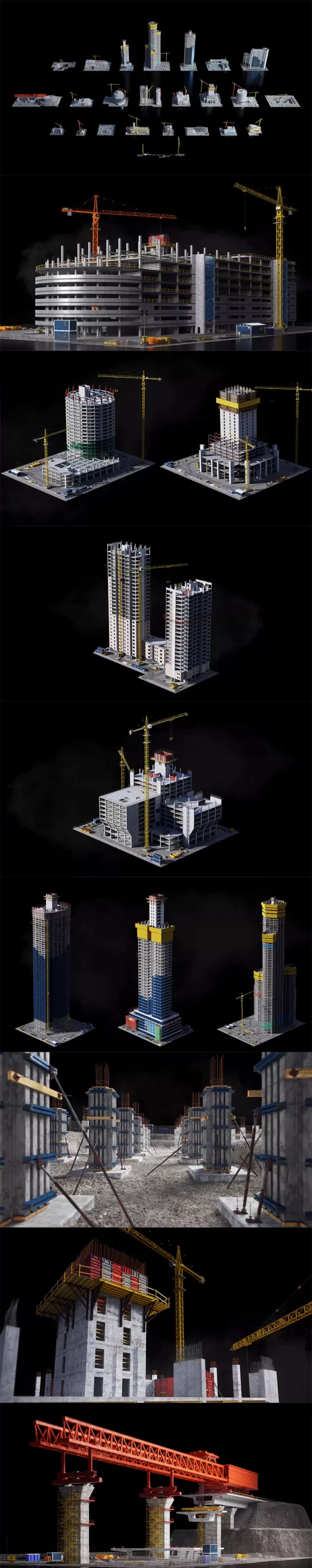 Blender工地楼房建筑施工设备起重机吊塔3D模型 Kitbash3D – Construction Zone