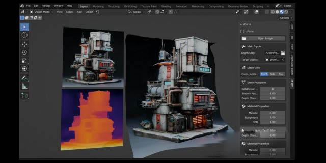 zForm 可以将现有的深度图和图像转换为3D模型。用户界面简化了流程,只需最少的步骤,并加快了您在 Blender 中使用深度图和图像的工作流程。