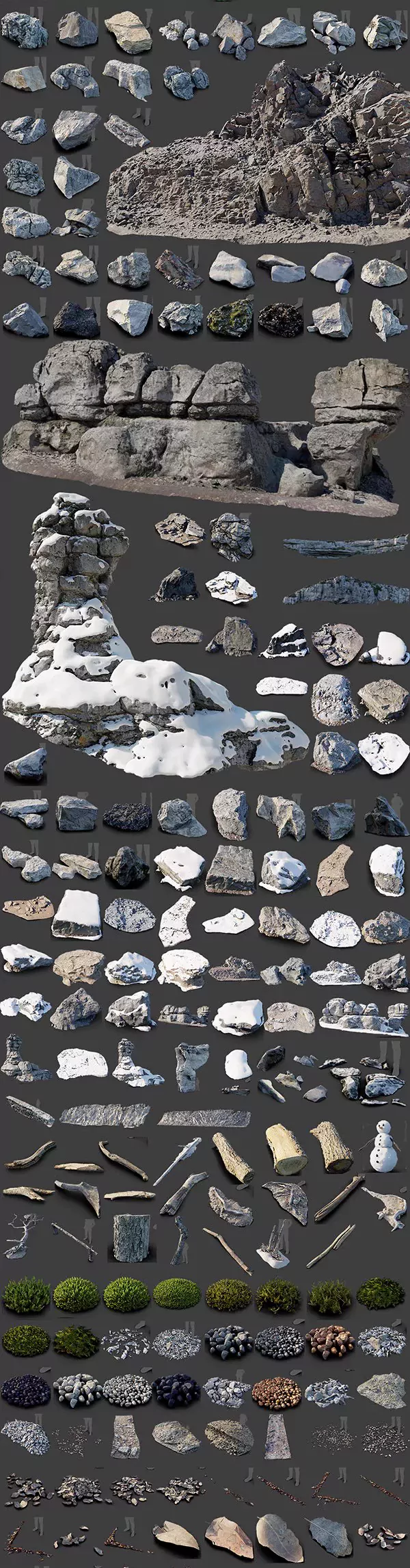 - 多样化的岩石模型:该预设包中包含了多种不同形状和风格的岩石模型,包括山石、巨石、小石头等。这些模型可以方便地用于创建各种自然环境场景。