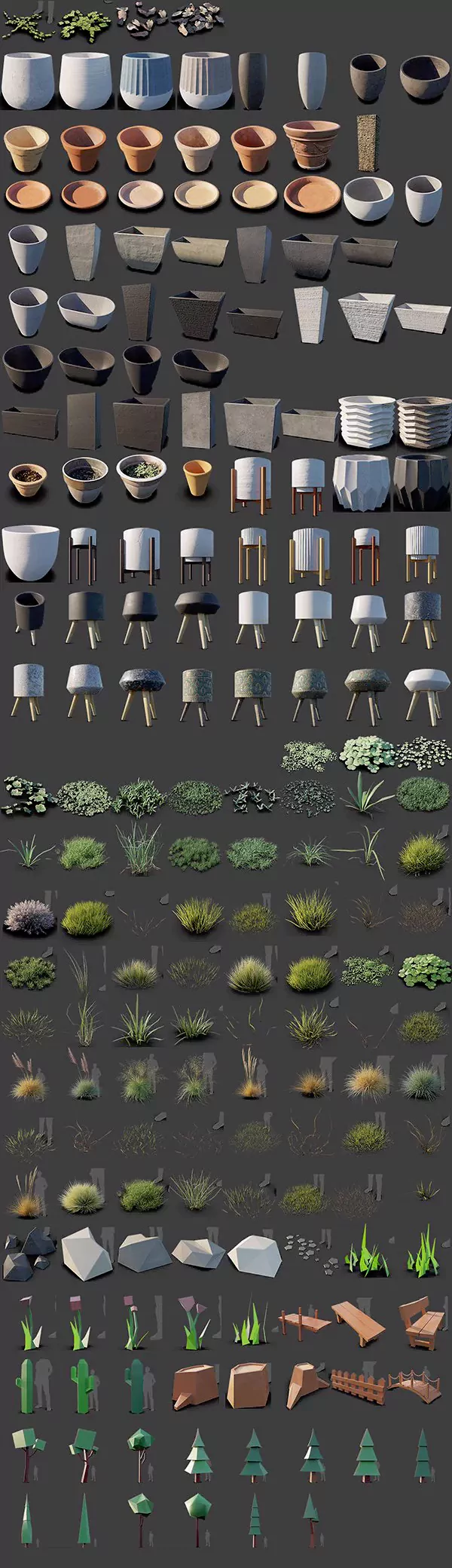 - 精美的材质:预设包中的模型都带有精美的材质,可以方便地用于渲染出逼真的自然环境场景。