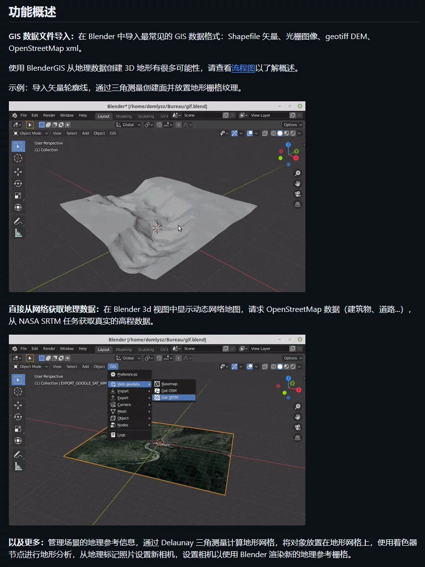GIS datafile import : Import in Blender most commons GIS data format : Shapefile vector, raster image, geotiff DEM, OpenStreetMap xml.
