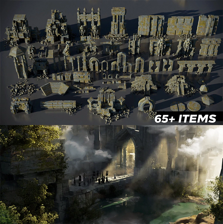 这是一个构建神秘古老寺庙废墟的场景3D模型资产包,包含了Blender和FBX格式的文件,提供多种低多边形和中多边形的元素,以快速制作废墟场景、神秘古老的建筑环境,非常适合创建寺庙废墟的主题场景。