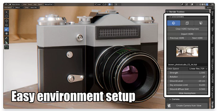 Render Toolbox是一款专为Blender打造的高效渲染增强插件,集HDRI灯光控制、交互式灯光绘制、相机书签、真实镜头特效等功能于一体。它能大幅简化你的渲染流程,一键添加环境光、快速管理灯光、保存完整相机设置,并为作品加入电影级特效。无论是作品集、产品渲染还是动画项目,Render Toolbox都能帮助更快获得专业、逼真的最终效果。