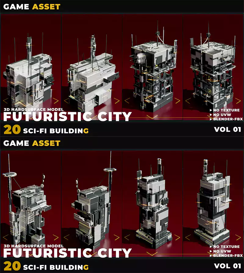 这套20 套科幻未来城市建筑模型包(Vol.01)为场景创作提供快速高效的解决方案。所有模型均采用轻量化结构设计,无UV、无贴图,适合在任意DCC软件中进行二次创作。可以直接用于快速搭建未来城市环境,也可以将其导入纹理软件进行自定义贴图,打造更具视觉冲击力的科幻建筑群。包含Blender、FBX、OBJ、C4D 四种格式。