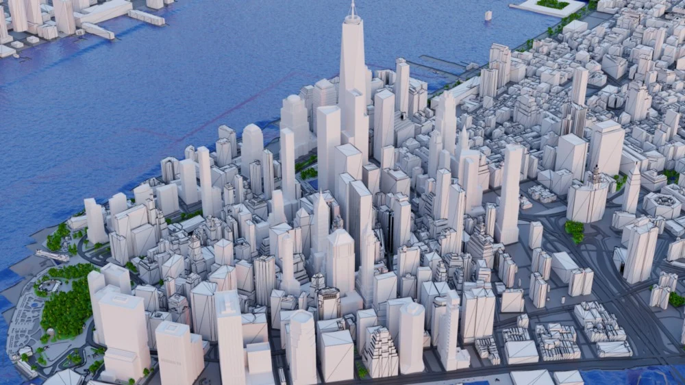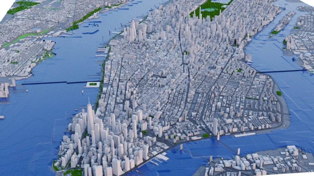 这是基于 GIS 数据缩放纽约市及其周边地区的 3D 城市模型的精确和准确的比例