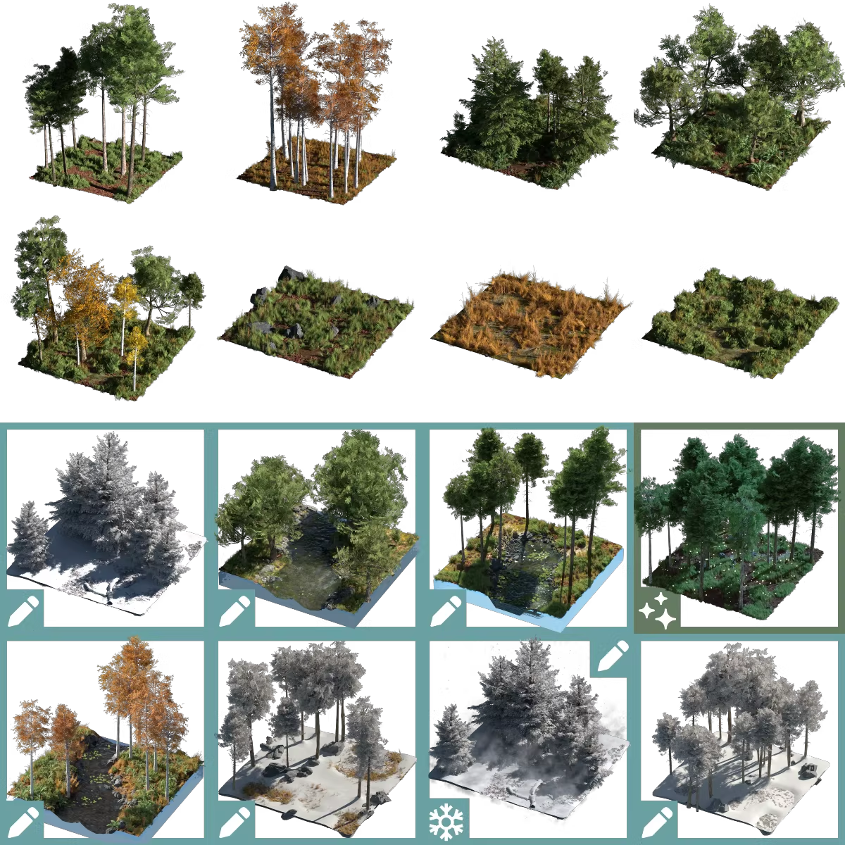- 插件形式:一键生成高品质森林,包括控制池塘与湖泊造景、雪地生态效果、粒子环境特效等,基于几何节点系统,通过绘画模式来控制需要生成的场景